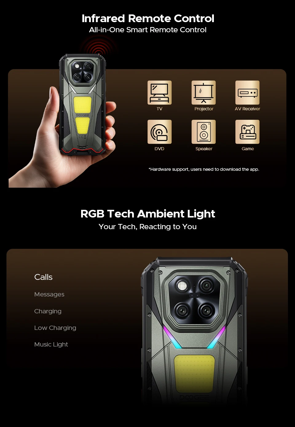 Výbušný debut, ktorý si zamilovali používatelia po celom svete! Hlavné vlastnosti vlajkovej rady DOOGEE Outdoor Vreckový projektor s automatickým zaostrovaním / mega batéria 20 500 mAh Dvojité kempingové svetlo s maximálnym jasom 1200 lúmenov / MediaTek Dimensity 7300 130dB veľký reproduktor / 200MP hlavný fotoaparát / Android 15 16 GB základná RAM, 512 GB ROM / 6,78" FHD+ IPS displej RGB technológia pre osvetlenie okolitého svetla / infračervené diaľkové ovládanie / zábava s AI projektorom Gemini Projekcia jedným stlačením – Ľahko si prispôsobte projekciu Krištáľovo čistá projekcia pre každý okamih