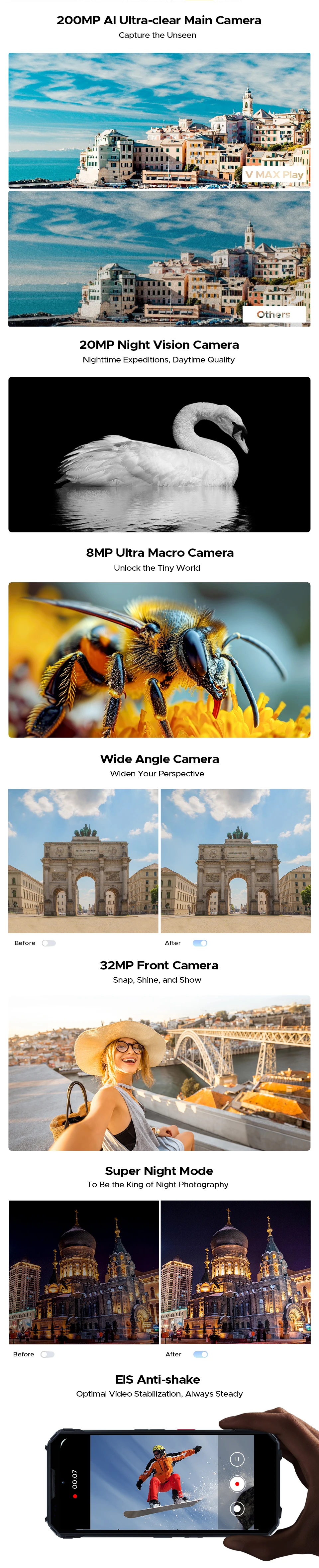 Svetová premiéra: DOOGEE V Max Play 5G projektor, odolný telefón, 20500mAh, duálne kempingové svetlo, rozmery 7300, 16GB + 512GB, inteligentný telefón s NFC Funkcia 1 ---- Podpora projektora \/ 854 * 480 \/ 100LM \/ automatické zaostrovanie Funkcia 2 --- Podpora funkcie infračerveného diaľkového ovládania Funkcia 3 --- Duálne kempingové svetlá \/ 1200LM \/ Podpora nastavenia jasu Funkcia 4 --- svetelný efekt V Max Play ---- MediaTek Dimensity 7300 \/ 4nm \/ Osem jadier RAM a ROM ------ 36 GB RAM (16 GB + až 20 GB rozšíriteľná RAM) \/ LPDDR5 + 512 GB ROM \/ uMCP Externé úložisko ------ Karta T-Flash až do 2 TB Displej ------ 6,78 palcov FHD+ IPS displej bez výrezov \/ 120 Hz Zadný fotoaparát ------ Trojitý fotoaparát s umelou inteligenciou (200 MP + 8 MP + 20 MP) 200MP hlavný fotoaparát + 8MP ultraširokouhlý a makro fotoaparát + 20MP kamera s nočným videním Predný fotoaparát ------ Predný fotoaparát 32MP Ultra HD Batéria ------20500mAh Veľká batéria \/ 45W bleskové nabíjanie \/ 10W reverzné nabíjanie Wi-Fi ------- Podpora WiFi6E (802.11ax\/ac\/b\/g\/n) Operačný systém -------Android 15 Rozmery ---183,5*85,4*30,5 mm a 683 g SIM slot --- Trojitý slot pre karty (podpora 2 SIM kariet + 1 TF karty) Navigácia ---- GPS | Glonass | Galileo | Beidou L1+L5 Ďalšie vlastnosti: ·NFC podporuje Google Pay · Veľký reproduktor s hlasitosťou 130 dB · Podpora Widevine L1 Konektivita: NR: N1\/N3\/N7\/N28\/N38\/N41\/N77\/N78\/N79 FDD: B1\/2\/3\/4\/5\/7\/8\/12\/13\/17\/18\/19\/20\/25\/26\/28A\/28B\/66 TDD: B34\/38\/39\/40\/41 WCDMA: B1\/2\/4\/5\/6\/8\/19 CDMA: BC0\/BC1\/BC10 GSM: B2\/3\/5\/8 Podpora EDGE\/GPRS